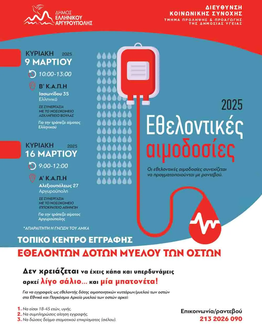 Ο Δήμος Ελληνικού Αργυρούπολης συνεχίζοντας το καθημερινό κοινωνικό του έργο για την ανάπτυξη του εθελοντισμού, της κοινωνικής αλληλεγγύης και τη στήριξη όσων έχουν ανάγκη σε αίμα, ανακοινώνει τις πρώτες εθελοντικές αιμοδοσίες για το 2025.
