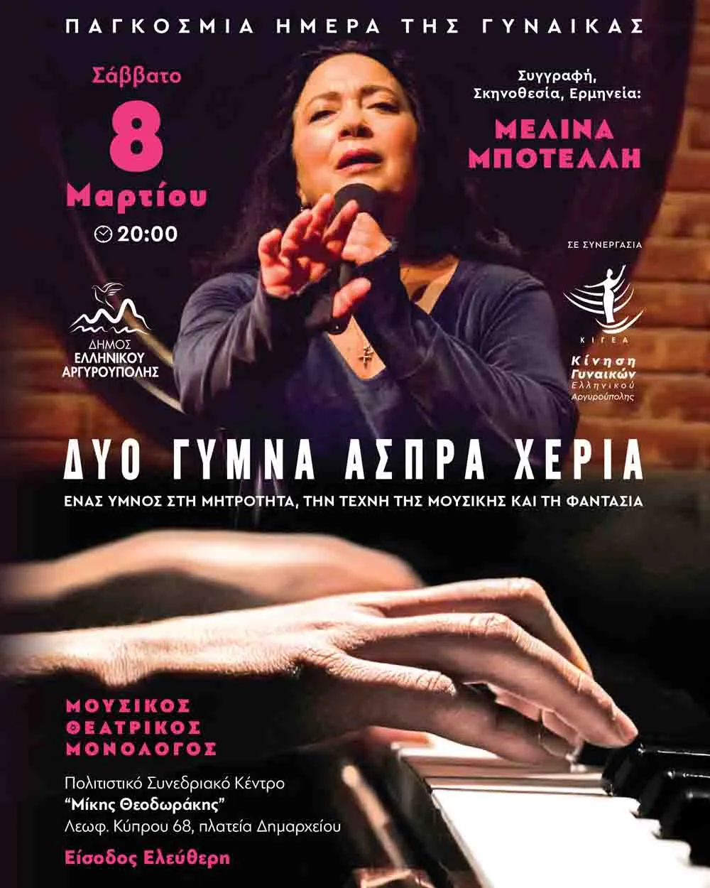 Η παράσταση θα πραγματοποιηθεί με ελεύθερη είσοδο, σε συνεργασία με την Κίνηση Γυναικών Ελληνικού – Αργυρούπολης, προσκαλώντας το κοινό να γίνει κοινωνός μιας βραδιάς γεμάτης τέχνη, συγκίνηση και βαθιά μηνύματα.