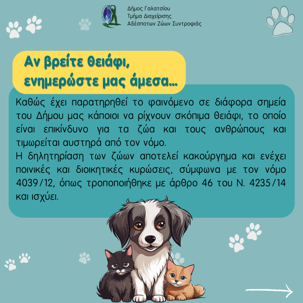 Δήμος Γαλατσίου προς δημότες: Αν εντοπίσετε θειάφι, ενημερώστε άμεσα το Τμήμα Διαχείρισης Αδέσποτων Ζώων Συντροφιάς του Δήμου