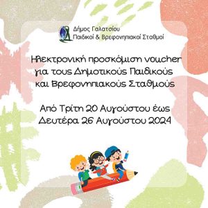 Στον Δήμο Γαλατσίου, ξεκινά από σήμερα η ηλεκτρονική προσκόμιση voucher για τους Δημοτικούς και Βρεφονηπιακούς Σταθμούς.