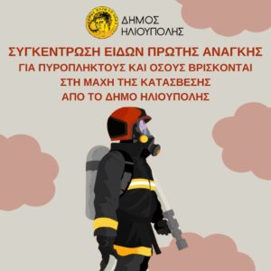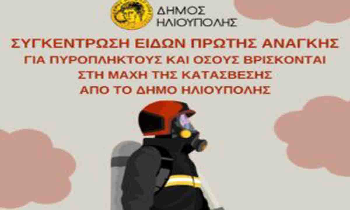 Οι πολίτες μας που επιθυμούν να βοηθήσουν μπορούν να προσκομίσουν τα είδη πρώτης ανάγκης στην είσοδο του Δημαρχείου Ηλιούπολης τις καθημερινές από τις 07:00π.μ έως και τις 22:00μ.μ., το Σαββατοκύριακο και την ημέρα του Δεκαπενταύγουστου από τις 07:00π.μ έως τις 14:00μ.μ.