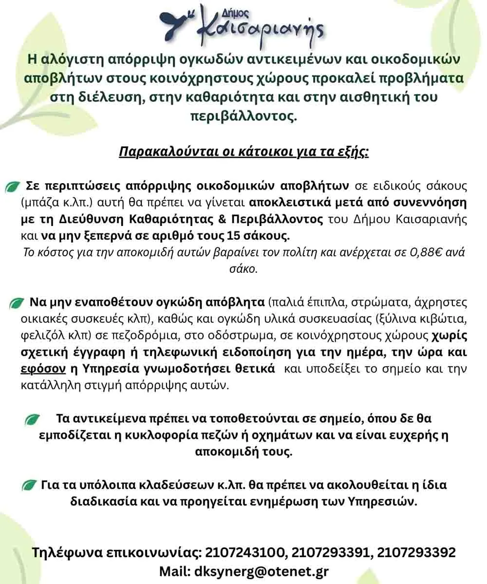 Αύξηση του φαινομένου αλόγιστης εναπόθεσης ογκωδών απορριμμάτων παρατηρείται στον Δήμο Καισαριανής, με αποτέλεσμα τη ρύπανση της γειτονιάς, τη δυσκολία διέλευσης των κατοίκων και την σοβαρή παρεμπόδιση του έγκαιρου προγραμματισμού των υπηρεσιών καθαριότητας του Δήμου. Η δημοτική αρχή, εφιστά με ανακοίνωσή της την προσοχή στους κατοίκους & δημότες, καθώς ο Νόμος 5232/2025 όπως τροποποιήθηκε και ψηφίστηκε πρόσφατα έχει αυστηροποιήσει τις ποινές.