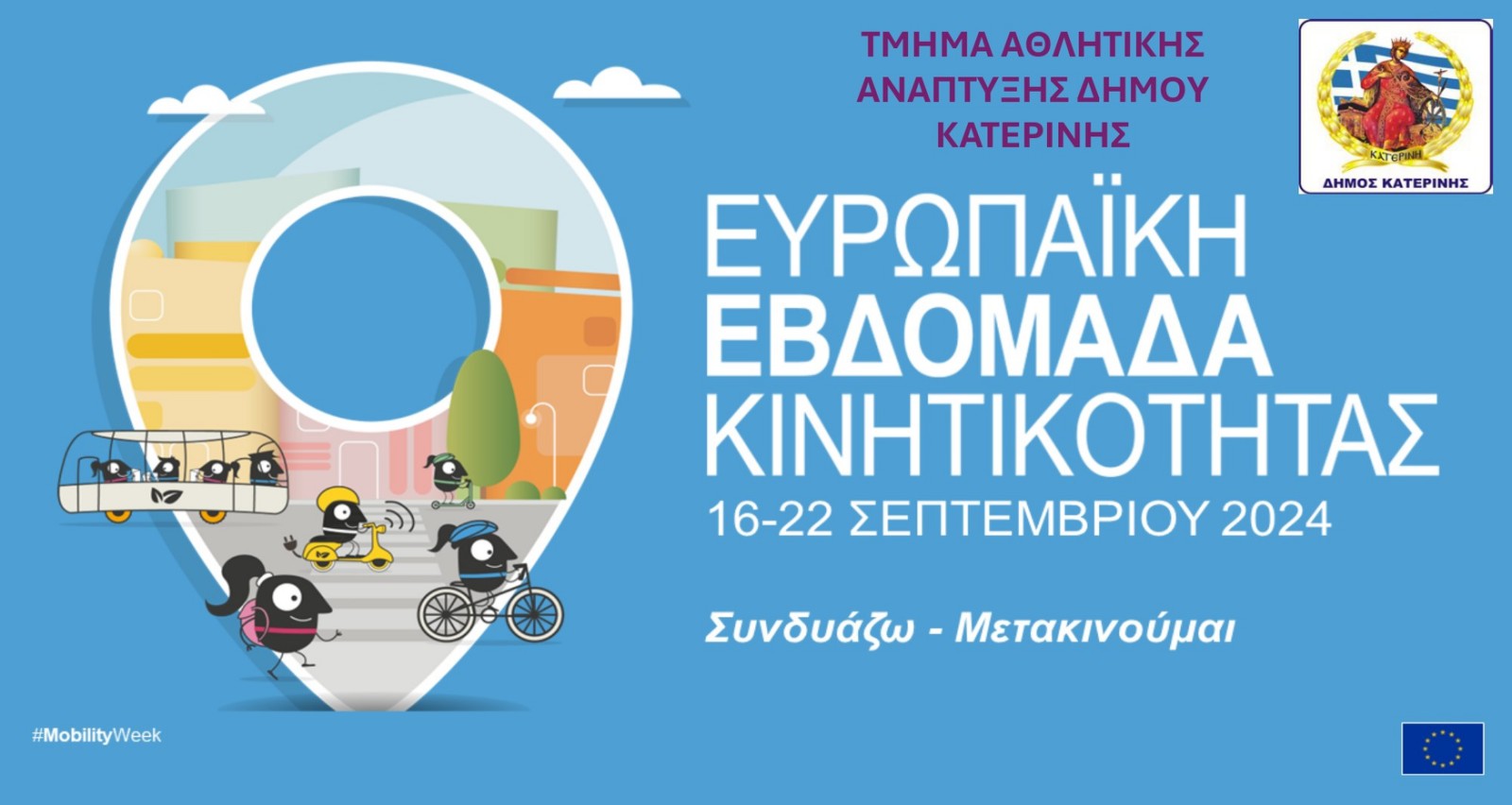 Σειρά δράσεων για την προώθηση βιώσιμων τρόπων μετακίνησης και την ευαισθητοποίηση των πολιτών στην υιοθέτηση εναλλακτικών τρόπων μεταφοράς, διοργανώνει ο Δήμος Κατερίνης ( Αντιδημαρχία Αθλητισμού/Τμήμα Αθλητικής Ανάπτυξης), την Ευρωπαϊκή Εβδομάδα Κινητικότητας, (16-22 Σεπτεμβρίου 2024).
