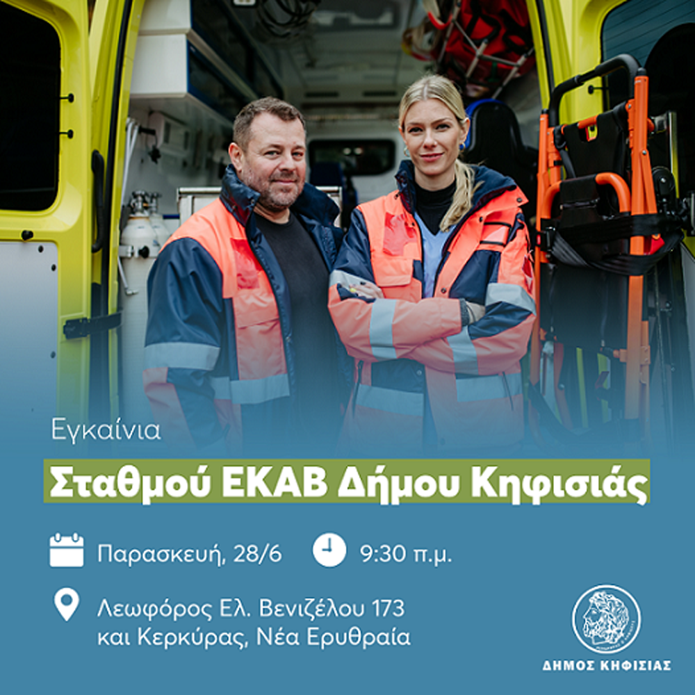 Ο Δήμαρχος Κηφισιάς Βασίλης Ξυπολυτάς έχει την τιμή να σας προσκαλέσει στα εγκαίνια λειτουργίας της κινητής ιατρικής μονάδας ΕΚΑΒ του Δήμου Κηφισιάς, που θα πραγματοποιηθούν την Παρασκευή 28 Ιουνίου 2024 στις 09.30 π.μ. στη Νέα Ερυθραία, Ελευθερίου Βενιζέλου 173 & Κερκύρας (είσοδος από οδό Κερκύρας).