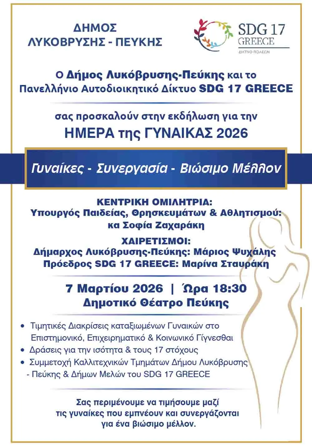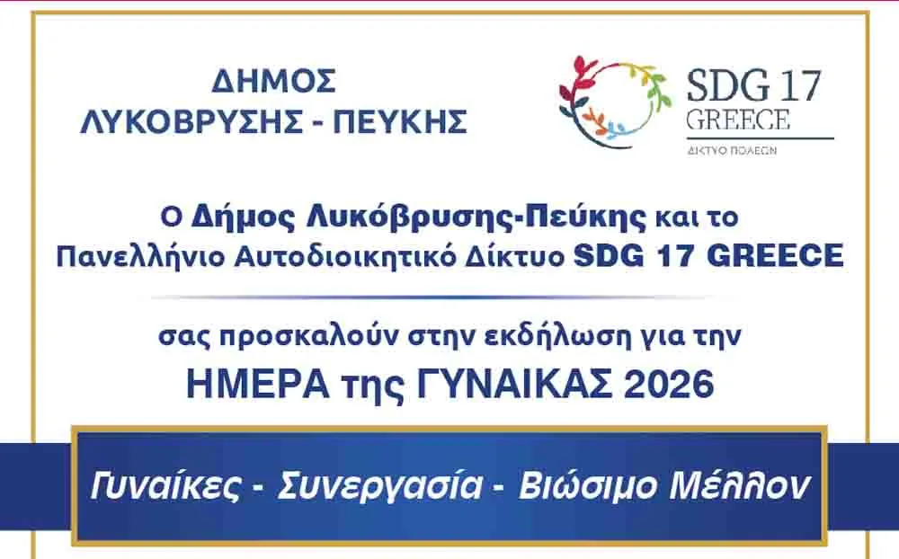 Ο Δήμος Λυκόβρυσης-Πεύκης σε συνεργασία με το Πανελλήνιο Αυτοδιοικητικό Δίκτυο SDG17 Greece διοργανώνει εκδήλωση με αφορμή την Παγκόσμια Ημέρα της Γυναίκας, το Σάββατο 7 Μαρτίου 2026 και ώρα 18:30 στο Δημοτικό Θέατρο Πεύκης.