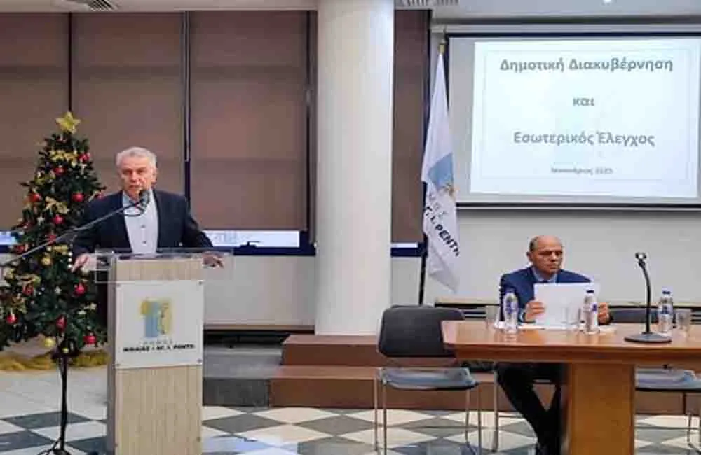 Ο Δήμαρχος στον χαιρετισμό του σημείωσε ότι η διοργάνωση αυτής της Εκδήλωσης γίνεται προς ενημέρωση και συζήτηση αυτού του σημαντικού θέματος της Διακυβέρνησης του Δήμου που ως κύρια στοιχεία έχει τη Διοίκηση και τον Έλεγχό του, με κορυφαίες διαστάσεις το Δημοτικό Συμβούλιο και το Σύστημα Εσωτερικού Ελέγχου. Ο ρόλος και η σημασία του Δημοτικού Συμβουλίου έχει αναγνωριστεί. Το Σύστημα Εσωτερικού Ελέγχου πρέπει και αυτό να αναδειχθεί ως μια σημαντική λειτουργία του Δήμου, κάτω από τις νέες θεσμικές εξελίξεις και οφείλει να δομηθεί και να λειτουργεί αποτελεσματικά στον Δήμο.
