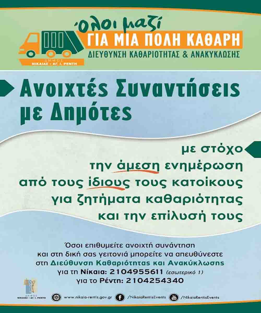 Στο πλαίσιο αυτό καλούνται όσοι επιθυμούν να συμμετέχουν ενεργά σ’ αυτές τις δράσεις και συναντήσεις μπορούν να επικοινωνούν με τη Διεύθυνση Καθαριότητας και Ανακύκλωσης στο τηλ.2104955611