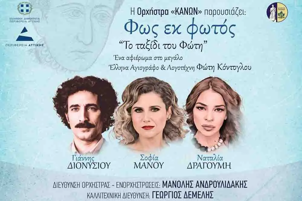 Η Περιφέρεια Αττικής και ο Δήμος Παιανίας, στο πλαίσιο της πολιτιστικής τους δράσης «Αγκαλιά στις γειτονιές μας», παρουσιάζουν μια ξεχωριστή μουσική βραδιά αφιερωμένη στον σπουδαίο Έλληνα αγιογράφο και λογοτέχνη Φώτη Κόντογλου, με τίτλο: «Φως εκ φωτός – Το ταξίδι του Φώτη», την Κυριακή 20 Ιουλίου 2025 και ώρα 21:00 στη Κεντρική Πλατεία Βασιλέως Κωνσταντίνου στην Παιανία, (έμπροσθεν του Καθεδρικού Ναού Ζωοδόχου Πηγής).