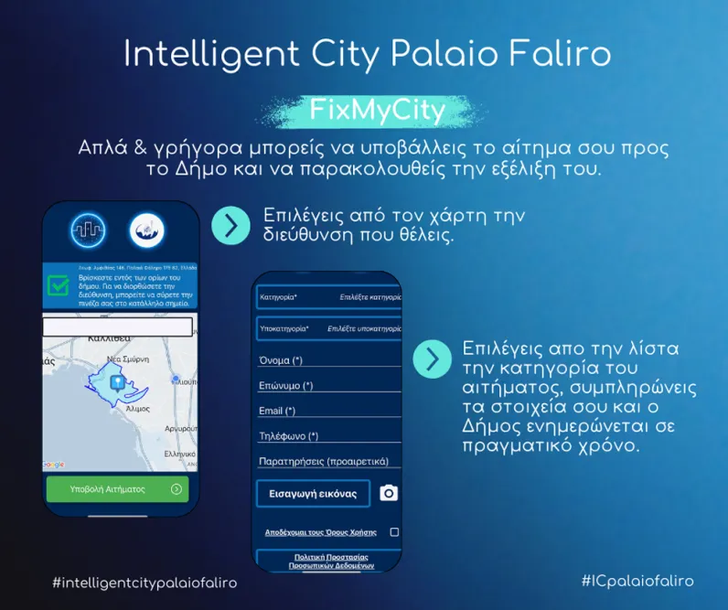 Μέσω της εφαρμογής Intelligent City Palaio Faliro, που από σήμερα οι πολίτες έχουν τη δυνατότητα να εγκαθιστούν στη συσκευή τους, μπορούν να δηλώνουν σε πραγματικό χρόνο βλάβες ή προβλήματα στα σημεία που παρουσιάζονται, όπως: προβλήματα φωτισμού, λακκούβες, σπασμένα πεζοδρόμια, εγκαταλελειμμένα οχήματα κλπ.