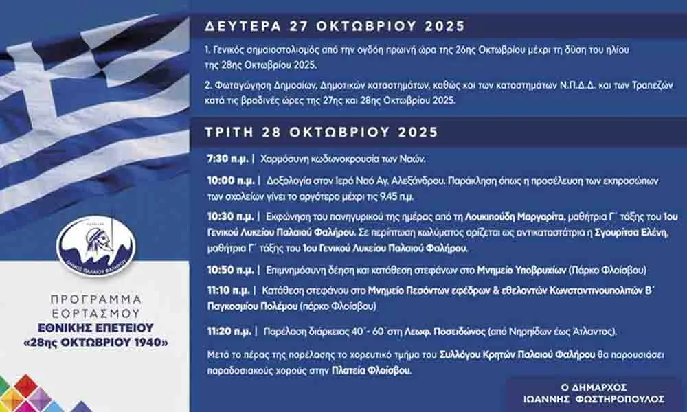 Τριήμερος θα είναι ο εορτασμός της Εθνικής επετείου της 28ης Οκτωβρίου, στον Δήμου Παλαιού Φαλήρου. Όπως ανακοινώθηκε από το Δήμο, την Κυριακή 26 Οκτωβρίου, θα γίνει ο σημαιοστολισμός του Δήμου, της παραμονή 27/10 θα υπάρξει η φωταγώγηση όλων των δρόμων, πλατειών και κοινόχρηστων χώρων του δήμου, ανήμερα δε της 28ης Οκτωβρίου, το εορταστικό πρόγραμμα θα ξεκινήσει στις 7:30 με κοδωνοκρουσία των ιερών ναών της πόλης και θα ολοκληρωθεί στις 11:20 το πρωί με την καθιερωμένη παρέλαση…