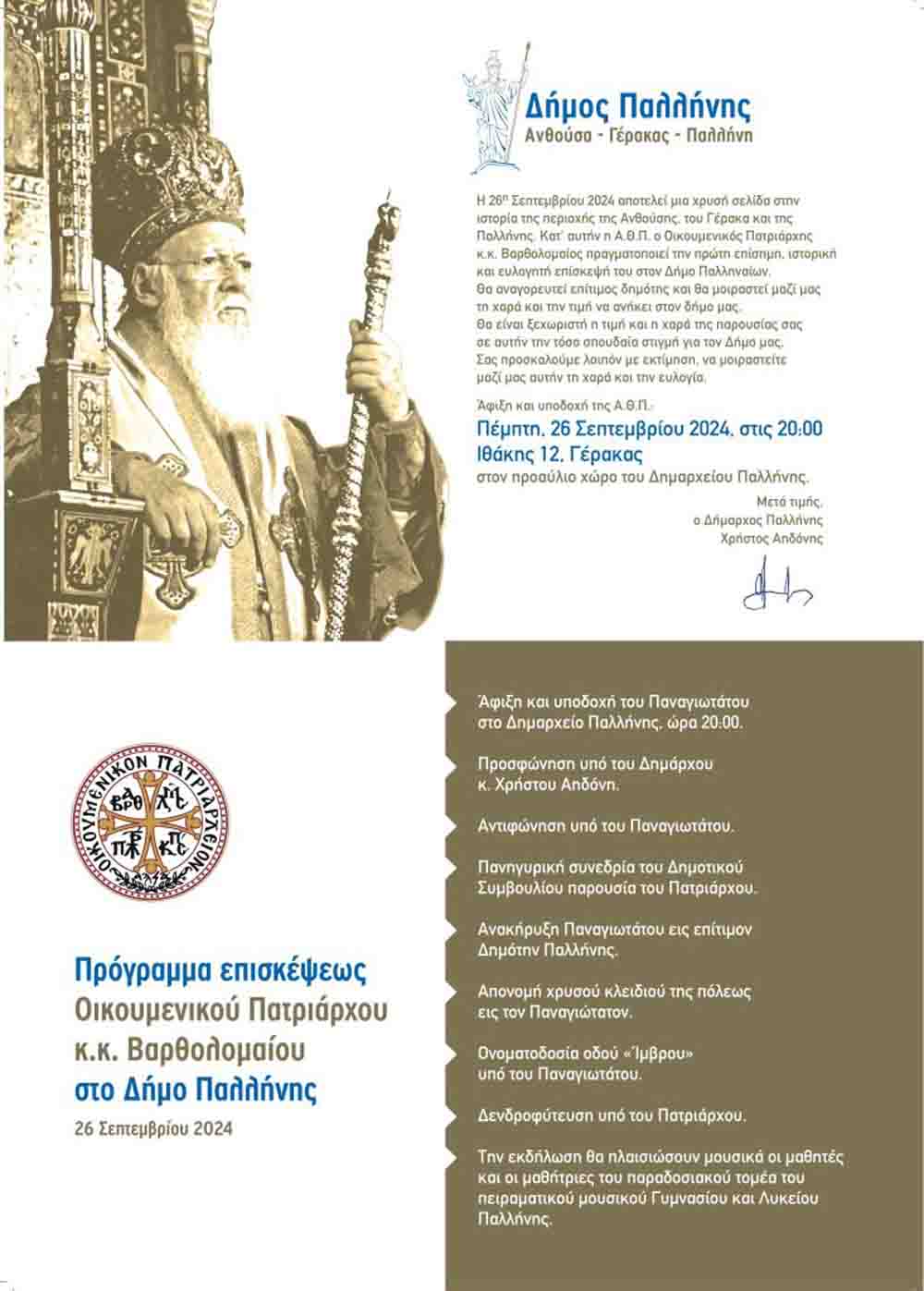 Πρόγραμμα επισκέψεως Οικουμενικού Πατριάρχου κ.κ. Βαρθολομαίου στο Δήμο Παλλήνης 26 Σεπτεμβρίου 2024
