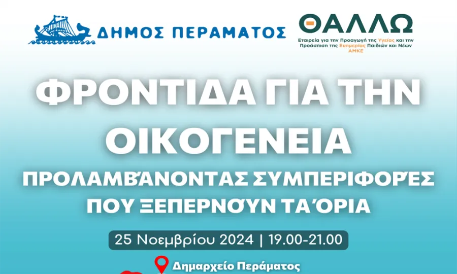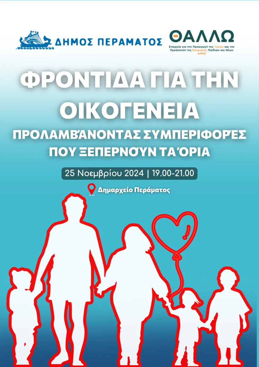 Για το λόγο αυτό, ο Δήμος Περάματος, σε συνεργασία με την εταιρία για την προαγωγή της υγείας και την προάσπιση της ευημερίας παιδιών, εφήβων και νέων «Θαλλώ» (ΑΜΚΕ), σας προσκαλούν σε εσπερίδα με θέμα: «Φροντίδα για την Οικογένεια προλαμβάνοντας συμπεριφορές που ξεπερνούν τα όρια».