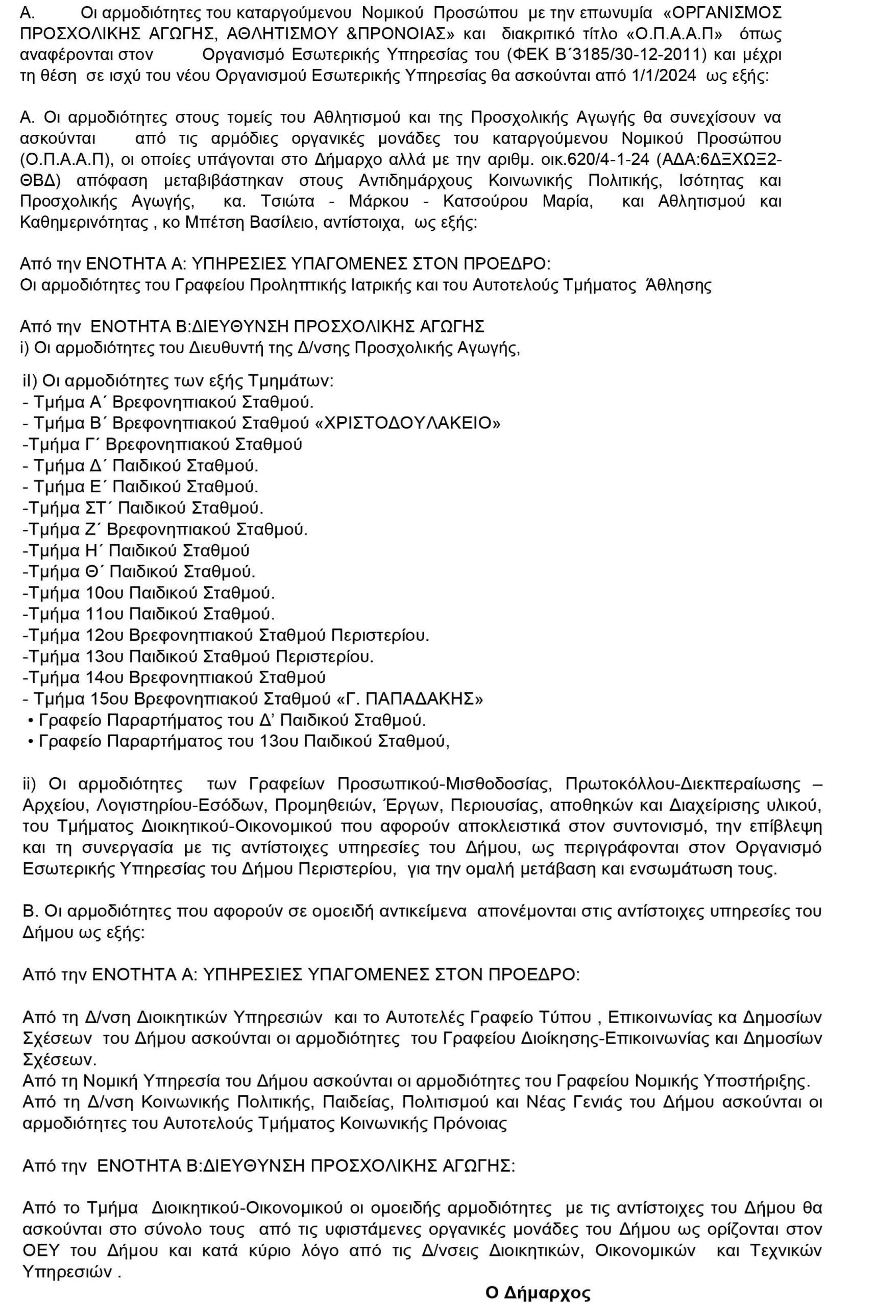 Με απόφασή του που δημοσιεύθηκε στο Διαύγεια στις 10 Ιανουαρίου, ο Δήμαρχος Περιστερίου, προχώρησε στην ανακατανομή και μεταφορά  των αρμοδιοτήτων του μέχρι 31.12.2023 Νομικού Προσώπου του Δήμου «ΟΠΑΑΠ», στους καθ’ύλη τομείς, αυτοτελή Γραφεία και Διευθύνσεις της διοικητικής πυραμίδας του Δήμου  ως εξής: