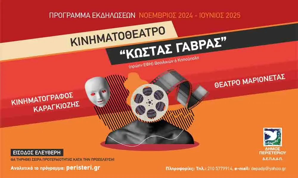 Στο Κινηματοθέατρο “Κώστας Γαβράς” Δήμου Περιστερίου (Βασιλικών 6, Κηπούπολη) πραγματοποιούνται πολιτιστικές δράσεις (κινηματογράφος, παιδικές ταινίες, θέατρο σκιών «Καραγκιόζης» και παραστάσεις «Μαριονέτας») έως και τον Ιούνιο 2025. H είσοδος είναι ελεύθερη. Θα τηρηθεί σειρά προτεραιότητας κατά την προσέλευση. Το πρόγραμμα των πολιτιστικών δράσεων συνεχίζεται ως εξής: