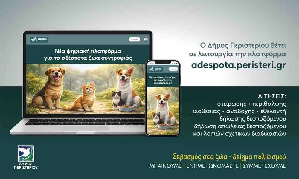 Ο Δήμος Περιστερίου ανακοινώνει την έναρξη λειτουργίας της νέας ψηφιακής πλατφόρμας adespota.peristeri.gr, με στόχο την αποτελεσματικότερη, σύγχρονη και διαφανή διαχείριση των αδέσποτων ζώων συντροφιάς στην πόλη.