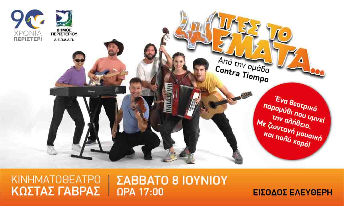 Ο Δήμος Περιστερίου με ανακοίνωσή του γνωστοποιεί ότι το Σάββατο 8 Ιουνίου 2024 και ώρα 17:00, στο Κινηματοθέατρο «Κώστας Γαβράς», θα πραγματοποιηθεί η θεατρική παράσταση “Πες το Ψέματα….” από την Ομάδα Contratiempo,  (Βασιλικών 6, Κηπούπολη). Είσοδος Ελεύθερη! Θα τηρηθεί σειρά προτεραιότητας!