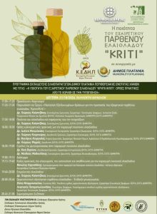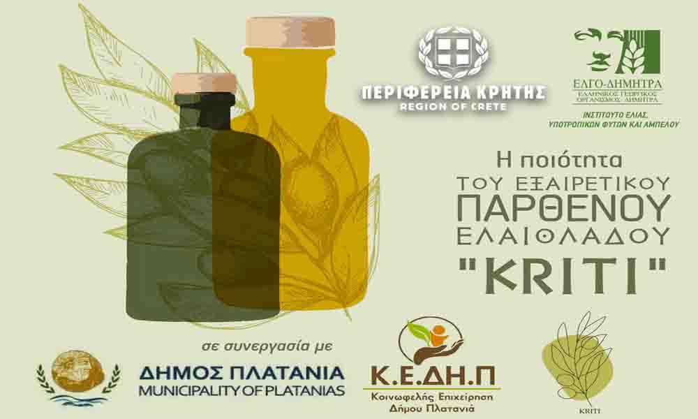 Η Περιφέρεια Κρήτης και ο Ελληνικός Γεωργικός Οργανισμός-ΔΗΜΗΤΡΑ (ΕΛΓΟ-ΔΗΜΗΤΡΑ), σε συνεργασία με το Δήμο Πλατανιά και την Κοινωφελή Επιχείρηση Δήμου Πλατανιά (ΚΕ.ΔΗ.Π.), διοργανώνουν εσπερίδα για την ποιότητα του Εξαιρετικού Παρθένου Ελαιόλαδου “Κρήτη/Kriti” η οποία θα πραγματοποιηθεί τη Δευτέρα 21 Οκτωβρίου 2024 στις 17:00 μ.μ στο Πολυκέντρο Βουκολιών.