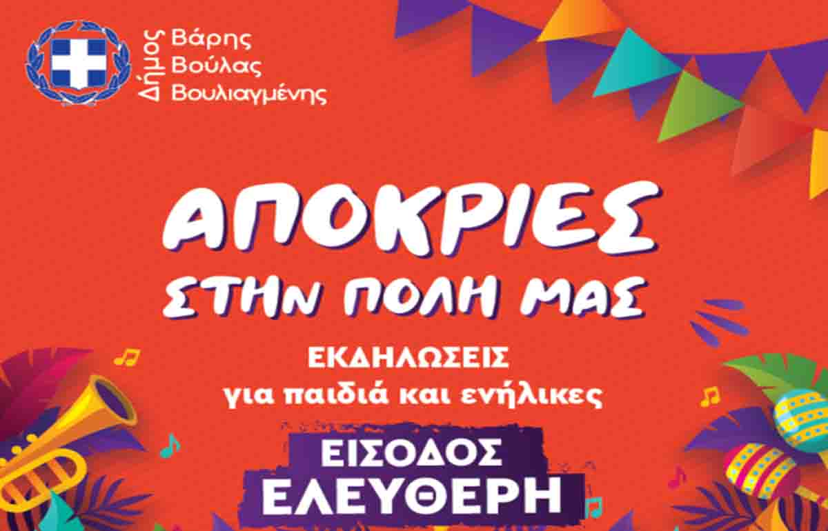 Με ένα μοναδικό εορταστικό πρόγραμμα για μικρούς και μεγάλους, ο Δήμος Βάρης Βούλας Βουλιαγμένης υποδέχεται και φέτος τις απόκριες. Συναυλία,θέατρο για παιδιά, αποκριάτικα έθιμα, δρώμενα, νησιώτικο γλέντι και μια μέρα αφιερωμένη στα παιδιά με εργαστήρια, χορό, διαγωνισμούς, μουσική, παιχνίδια λούνα παρκ και πολλές πολλές εκπλήξεις, που θα ψυχαγωγήσουν και θα διασκεδάσουν τους πολίτες και τους επισκέπτες της πόλης μας.