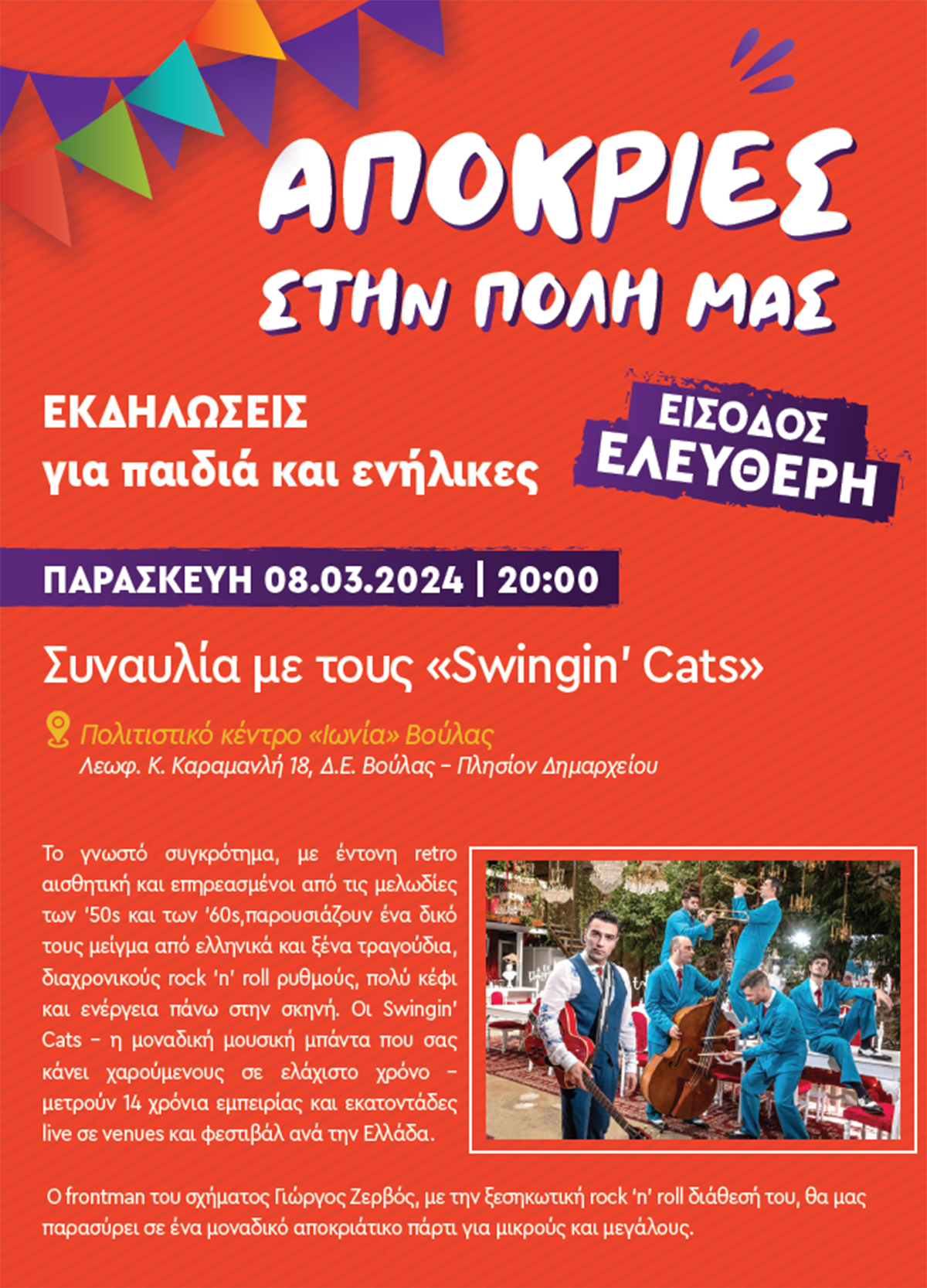 Το γνωστό συγκρότημα, με έντονη retro αισθητική και επηρεασμένοι από τις μελωδίες των ‘50s και των ‘60s, παρουσιάζουν ένα δικό τους μείγμα από ελληνικά και ξένα τραγούδια, διαχρονικούς rock ‘n’ roll ρυθμούς, πολύ κέφι και ενέργεια πάνω στην σκηνή. Oι Swingin’ Cats – η μοναδική μουσική μπάντα που σας κάνει χαρούμενους σε ελάχιστο χρόνο – μετρούν 14 χρόνια εμπειρίας και εκατοντάδες live σε venues και φεστιβάλ ανά την Ελλάδα. Ο frontman του σχήματος Γιώργος Ζερβός, με την ξεσηκωτική rock ‘n’ roll διάθεσή του, θα μας παρασύρει σε ένα μοναδικό αποκριάτικο πάρτι για μικρούς και μεγάλους.