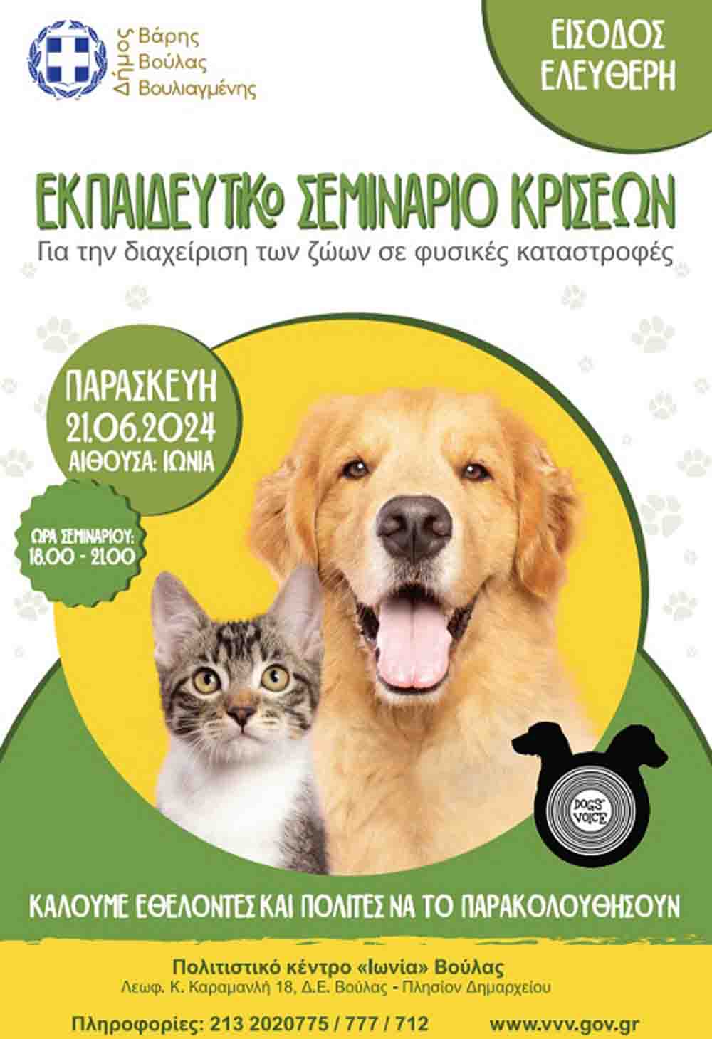 Εκπαιδευτικό Σεμινάριο Κρίσης για τη διαχείριση των ζώων σε φυσικές καταστροφές, διοργανώνει ο Δήμος Βάρης Βουλιαγμένης σε συνεργασία με την Dogs’Voice, την Παρασκευή 21 Ιουνίου από τις 18:00 έως τις 21:00, στο Πολιτιστικό Κέντρο «ΙΩΝΙΑ».