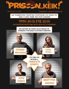 Την φιλανθρωπική θεατρική παράσταση «Prison… Κείκ!», παρουσιάζουν την Τρίτη 30 Δεκεμβρίου στις 20:00, στο Πολιτιστικό Κέντρο «Ιωνία» η «House of NK Productions» και ο Δήμος Βάρης Βούλας Βουλιαγμένης. όπως αναλύθηκε στο airetos.gr Πρόκειται μια ξεκαρδιστική κωμωδία αφιερωμένη στα παιδιά του Make–A–Wish (Κάνε-Μια-Ευχή Ελλάδος). Αντί εισιτηρίου, στην είσοδο του χώρου θα υπάρχει collection box του Οργανισμού για ελεύθερη συνεισφορά.