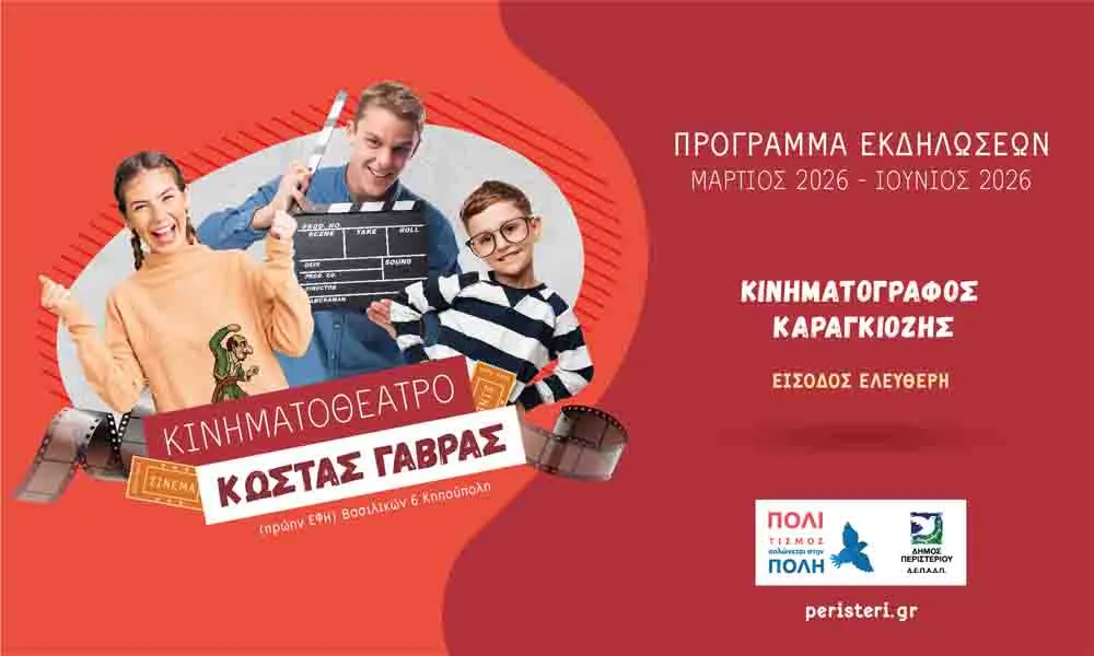Ένα τετράμηνο γεμάτο πολιτισμό, κινηματογράφο και θέατρο σκιών φιλοξενεί το Κινηματοθέατρο «Κώστας Γαβράς» (Βασιλικών 6, Κηπούπολη) Δήμου Περιστερίου, από τον Μάρτιο έως και τον Ιούνιο 2026, με ελεύθερη είσοδο για όλους και τήρηση σειράς προτεραιότητας κατά την προσέλευση.
