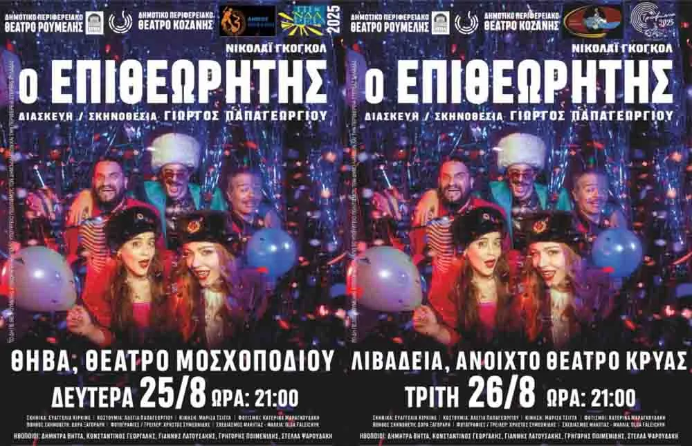 Η εξαιρετική θεατρική παράσταση «Ο Επιθεωρητής» του Νικολάι Γκόγκολ, μια συμπαραγωγή του Δημοτικού Περιφερειακού Θεάτρου Ρούμελης με το Δημοτικό Περιφερειακό Θέατρο Κοζάνης ταξιδεύει στη Θήβα και στη Λιβαδειά για δυο μοναδικές παραστάσεις.