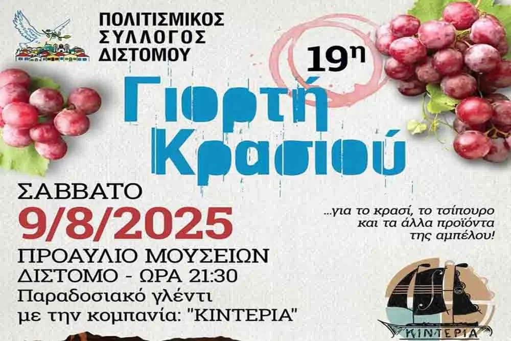 “19η Γιορτή Κρασιού Διστόμου”: Μια γιορτή αφιερωμένη στο Διστομίτικο κρασί, το τσίπουρο και τα παράγωγα της αμπέλου που αφθονεί στην περιοχή, από αρχαιοτάτων χρόνων.