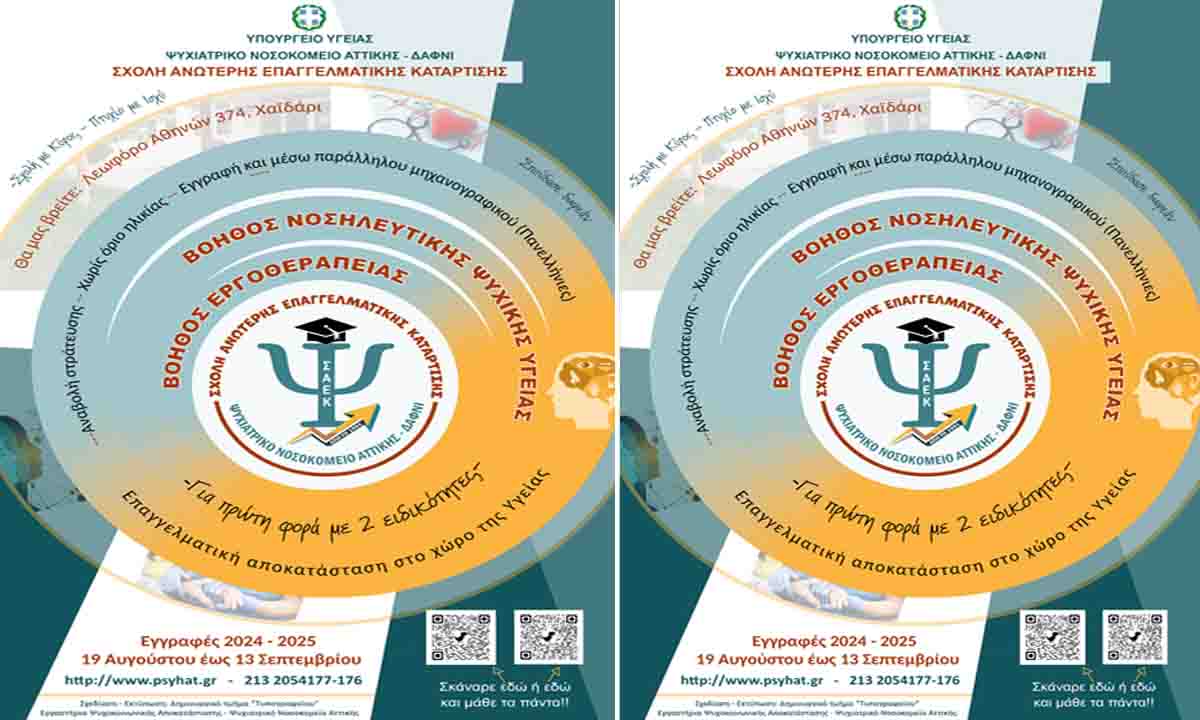 Θα θέλαμε να σας ενημερώσουμε ότι στο Ψυχιατρικό Νοσοκομείο Αττικής (Δαφνί) λειτουργεί τριάντα τρία (33) χρόνια Δημόσια Σχολή Ανώτερης Επαγγελματικής Κατάρτισης. Για το προσεχές σχολικό έτος 2024 -2025 στη Σχολή μας θα λειτουργήσουν 2 ειδικότητες 1) Βοηθός Νοσηλευτικής Ψυχικής Υγείας και 2) Βοηθός Εργοθεραπείας.