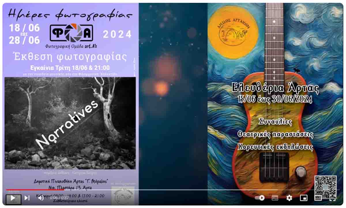 Κυριακή 18/6/2024: Φεστιβάλ φωτογραφίας “Ημέρες Φωτογραφίας Άρτας 2024”. Διάρκεια φεστιβάλ 18/6 έως 28/06/2024. Φ.Ο.Α. Φωτογραφική Ομάδα art.A’s. Στη Δημοτική Πινακοθήκη “Γιάννης Μόραλης”. Ώρα έναρξης: 21.00. Διοργάνωση: Φ.Ο.Α. Φωτογραφική Ομάδα art.A’s και Δήμος Αρταίων.