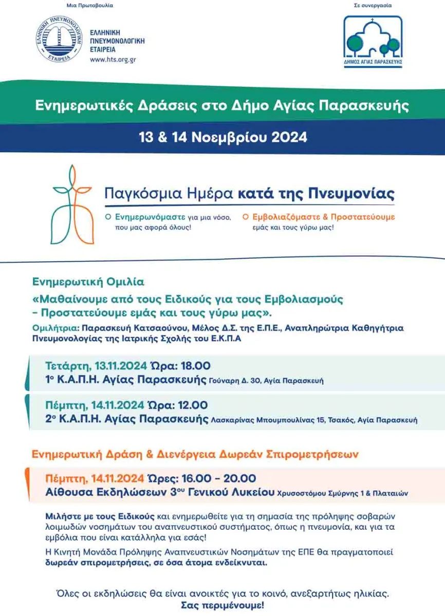 - Eιδικοί πνευμονολόγοι – μέλη της Ε.Π.Ε. θα βρίσκονται στην Αίθουσα Εκδηλώσεων του 3ου ΓΕ.Λ. Αγίας Παρασκευής (Χρυσοστόμου Σμύρνης 1 & Πλαταιών) την Πέμπτη 14/11/2024 και ώρες 16.00 – 20.00 για να ενημερώσουν το κοινό, σχετικά με τη σημασία της πρόληψης της πνευμονίας και άλλων σοβαρών λοιμωδών νοσημάτων καθώς και για τα εμβόλια που συστήνονται βάσει ηλικίας και άλλων παραγόντων. Παράλληλα, τις ίδιες ώρες θα γίνουν δωρεάν σπιρομετρήσεις στους πολίτες.