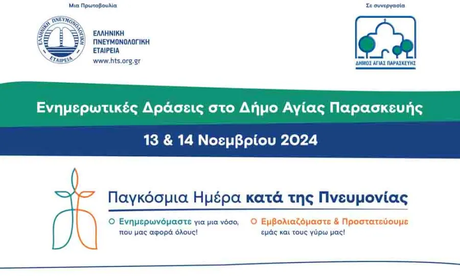 Ο Δήμος Αγίας Παρασκευής, σε συνεργασία με την Ελληνική Πνευμονολογική Εταιρεία (Ε.Π.Ε.), με αφορμή την Παγκόσμια Ημέρα κατά της Πνευμονίας, διοργανώνει, το διήμερο 13 & 14 Νοεμβρίου 2024, σειρά ενημερωτικών δράσεων με τίτλο: «Παγκόσμια Ημέρα κατά της Πνευμονίας: Ενημερωνόμαστε για μια νόσο που μας αφορά Όλους! Εμβολιαζόμαστε και Προστατεύουμε εμάς και τους γύρω μας!».