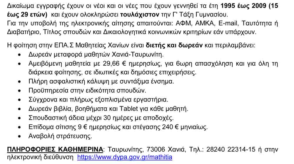 Ξεκίνησαν οι εγγραφές στην ΕΠΑΣ Μαθητείας Χανίων… Οι αιτήσεις γίνονται ηλεκτρονικά μέσω του gov.gr με κωδικούς TAXISnet στην ηλεκτρονική διεύθυνση: