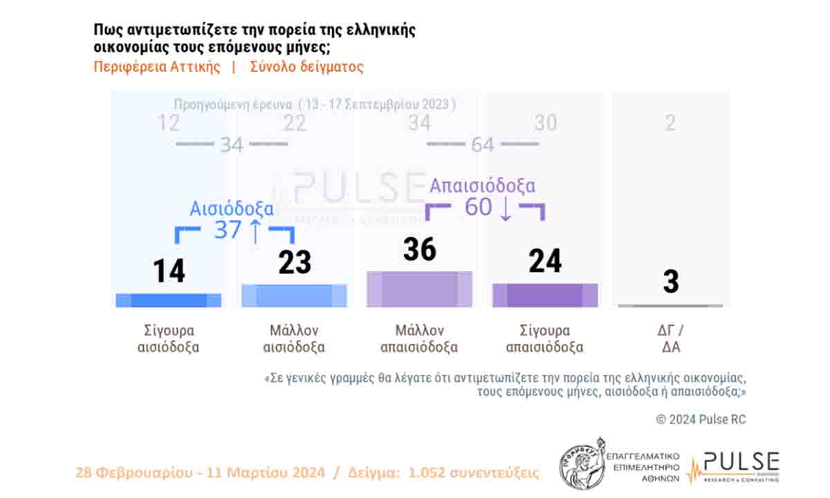 Σε έρευνα της Pulse RC για το Επαγγελματικό Επιμελητήριο Αθηνών, προκύπτουν εξαιρετικά ενδιαφέροντα αποτελέσματα και συμπεράσματα, κυρίως για την πορεία της οικονομίας, την ακρίβεια, το πρόβλημα στέγης ενώ εξετάζεται και το θέμα της συμμετοχής των ψηφοφόρων στις ευρωεκλογές.