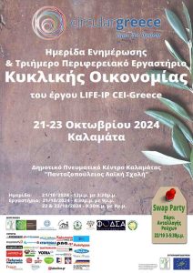 Ημερίδα Ενημέρωσης και Περιφερειακό Εργαστήριο Κυκλικής Οικονομίας, συνδιοργανώνουν το Πράσινο Ταμείο, το Υπουργείο Περιβάλλοντος και Ενέργειας (ΥΠΕΝ), η Περιφέρεια Πελοποννήσου, ο Δήμος Καλαμάτας, ο Φορέας Διαχείρισης Στερεών Αποβλήτων Πελοποννήσου (Φο.Δ.Σ.Α.), από τις 21 έως και τις 23 Οκτωβρίου, στην Καλαμάτα (Δημοτικό Πνευματικό Κέντρο Καλαμάτας – “Πανταζοπούλειος Λαϊκή Σχολή”, Αίθουσα: Αναγνωστήριο Λαϊκής Βιβλιοθήκης Καλαμάτας).