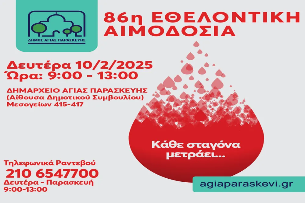 Ο Δήμος Αγίας Παρασκευής διοργανώνει την 86η Εθελοντική Αιμοδοσία με τίτλο «Δίνουμε Ζωή-Κάθε σταγόνα μετράει». Η αιμοδοσία θα πραγματοποιηθεί τη Δευτέρα 10 Φεβρουαρίου από τις 09:00 έως τις 13:00, στο Δημαρχείο Αγίας Παρασκευής (Μεσογείων 415-417, Αίθουσα Δημοτικού Συμβουλίου).