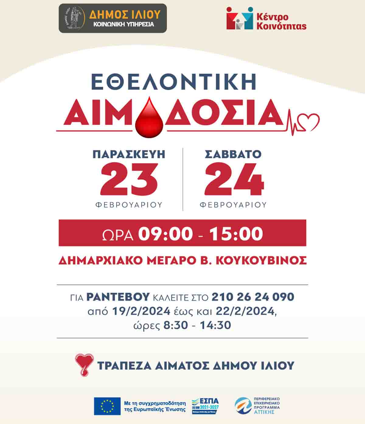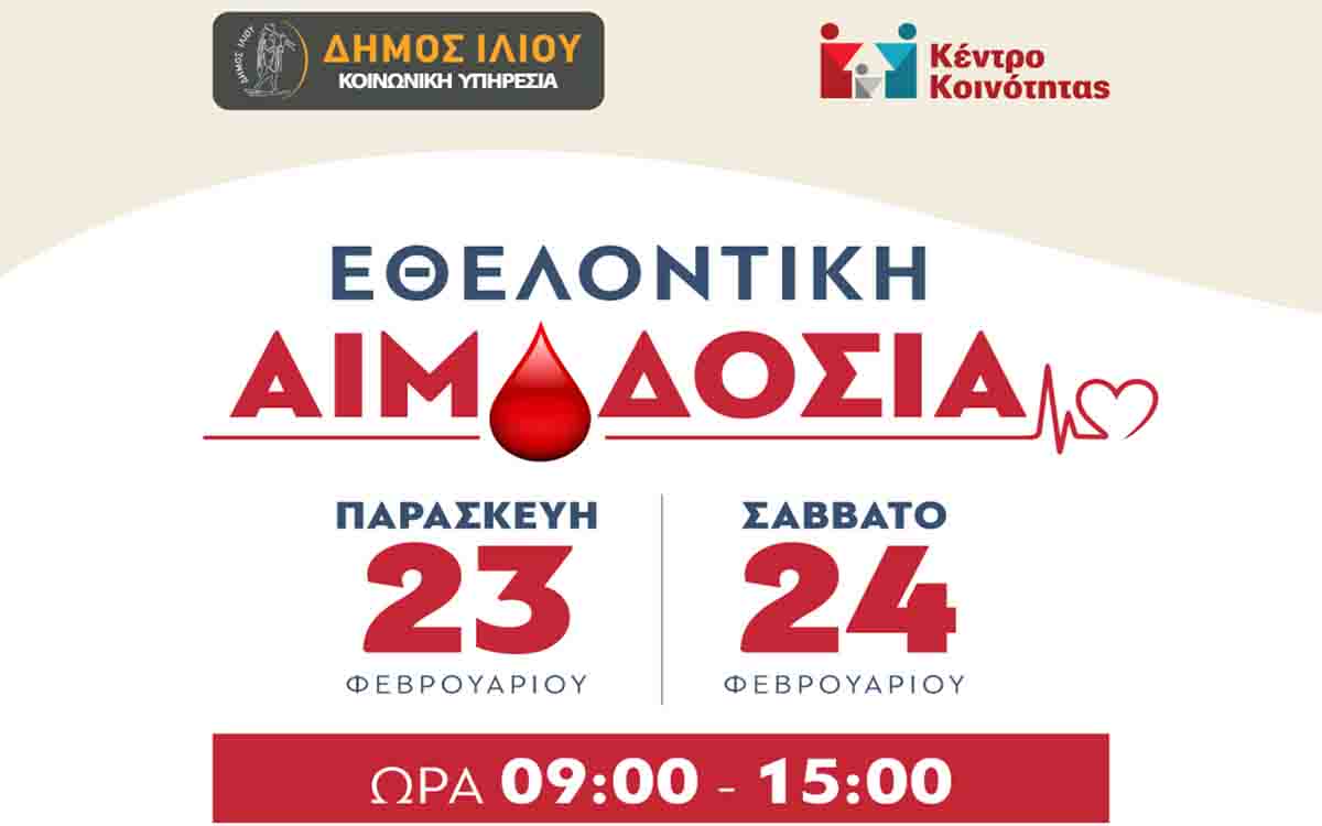 Ο Δήμος Ιλίου διοργανώνει Εθελοντική Αιμοδοσία την Παρασκευή 23 Φεβρουαρίου 2024 και το Σάββατο 24 Φεβρουαρίου 2024 από 9:00 – 15:00 στο Δημαρχιακό Μέγαρο Ιλίου Β. Κουκουβίνος (Αίθουσα Πολλαπλών Χρήσεων).