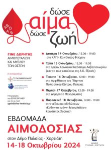 Τη Δευτέρα 14 έως και την Παρασκευή 18 Οκτωβρίου, πραγματοποιείται η καθιερωμένη, πλέον, εβδομάδα εθελοντικής αιμοδοσίας και λήψης δείγματος από υποψήφιους εθελοντές δότες μυελού των οστών σε όλες τις δημοτικές ενότητες του Δήμου Πυλαίας – Χορτιάτη.