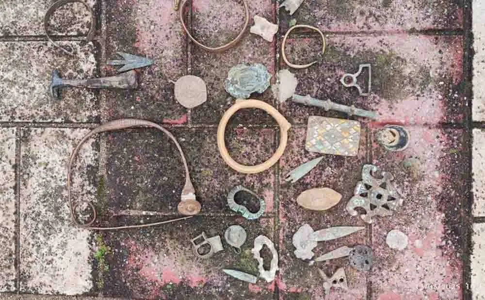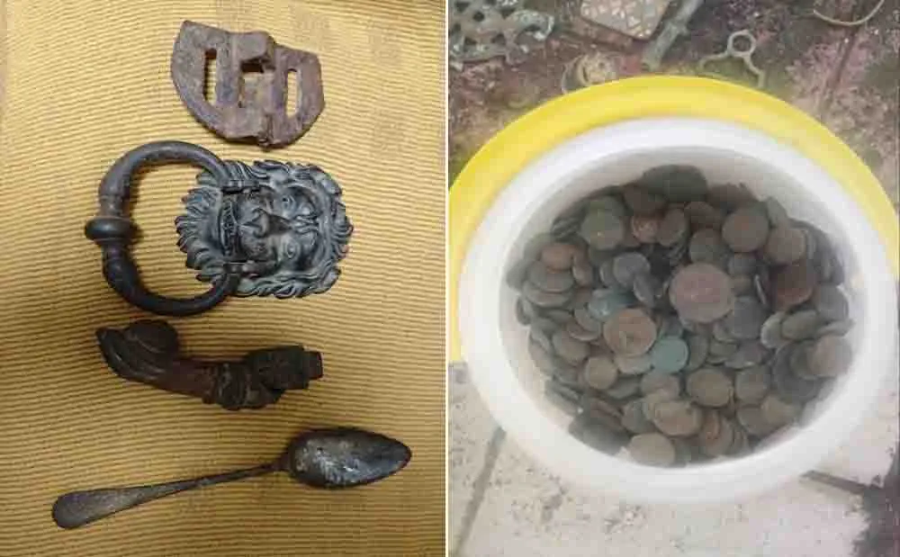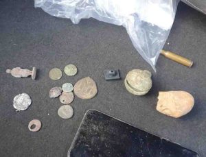 Κατασχέθηκαν, μεταξύ άλλων, πήλινη κεφαλή, μικρό ασημένιο άγαλμα, σταυρός, 18 δαχτυλίδια, 3 βραχιόλια, 17 κοσμήματα, 3 αγαλματίδια, επιτύμβια στήλη οθωμανικής περιόδου και 27 αγγεία, χιλιάδες νομίσματα, θρησκευτικές εικόνες, 2 μονόλιμπρα εκρηκτικής ύλης Τ.Ν.Τ., μικτού συνολικού βάρους -879- γραμμαρίων, δεκάδες συσκευές εντοπισμού και ανίχνευσης μετάλλων, περίστροφο και πιστόλι κρότου