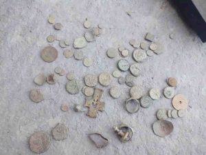 - χιλιάδες νομίσματα (χρυσά, χάλκινα και ασημένια διαφόρων περιόδων) και μεταλλικά αντικείμενα μικρών διαστάσεων, μεταξύ άλλων, μολύβδινοι πεσσοί σφενδόνης, χάλκινες πόρπες, αιχμές βελών, τμήματα βάσεων αγγείων,