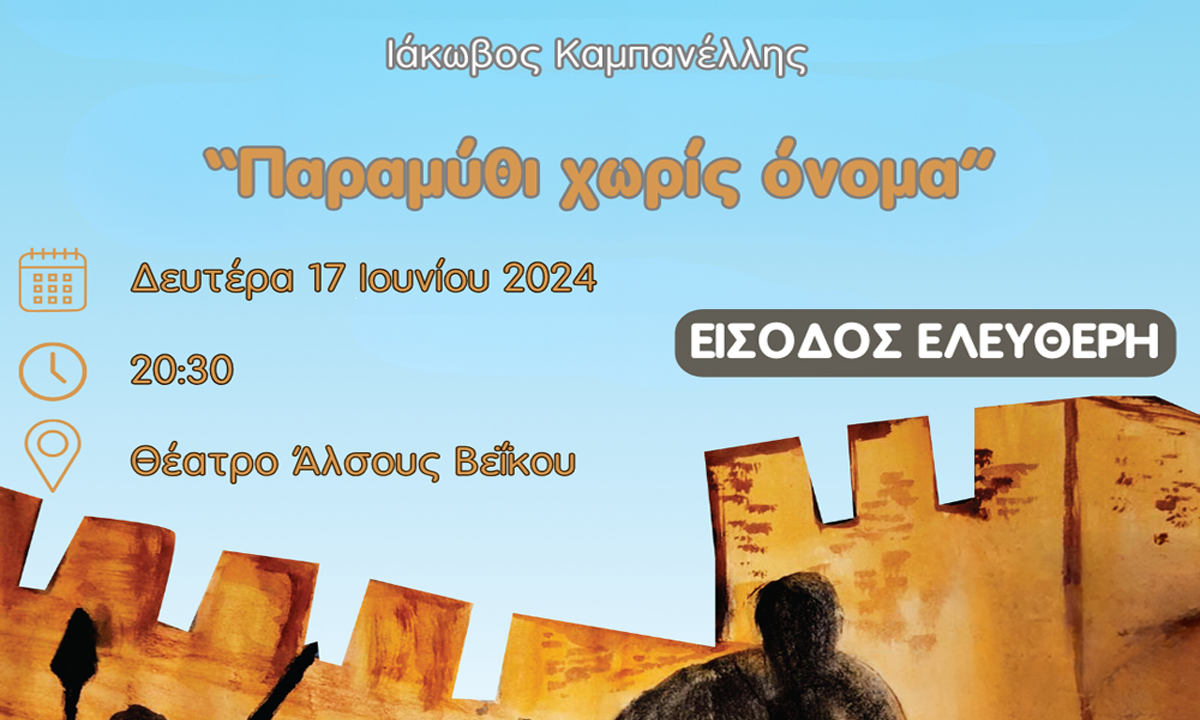 Την Δευτέρα 17 Ιουνίου, η θεατρική παράσταση «Παραμύθι χωρίς όνομα», του Ιάκωβου Καμπανέλη, ανεβαίνει στο Ανοιχτό Θέατρο Άλσους Βεΐκου, από τη Δημοτική Θεατρική Σκηνή Γαλατσίου, Ώρα έναρξης 20:30, σκηνοθεσία Γεωργία Δαμήλου, τραγούδι Πέτρος Καψάλης. Είσοδος ελεύθερη…