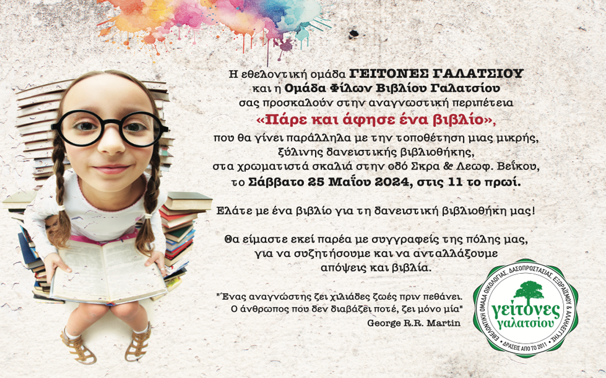 Θα μας τιμήσει ιδιαίτερα η παρουσία σας στην εκδήλωση μας για το βιβλίο, το Σάββατο 25 Μαΐου 2024, στις 11 το πρωί, στη Λεωφ. Βεικου και Σκρα, στο Γαλάτσι, με αφορμή την τοποθέτηση μίνι ξύλινης βιβλιοθήκης από την εθελοντική ομάδα ΓΕΙΤΟΝΕΣ ΓΑΛΑΤΣΙΟΥ και την Ομάδα Φίλων Βιβλίου Γαλατσίου.