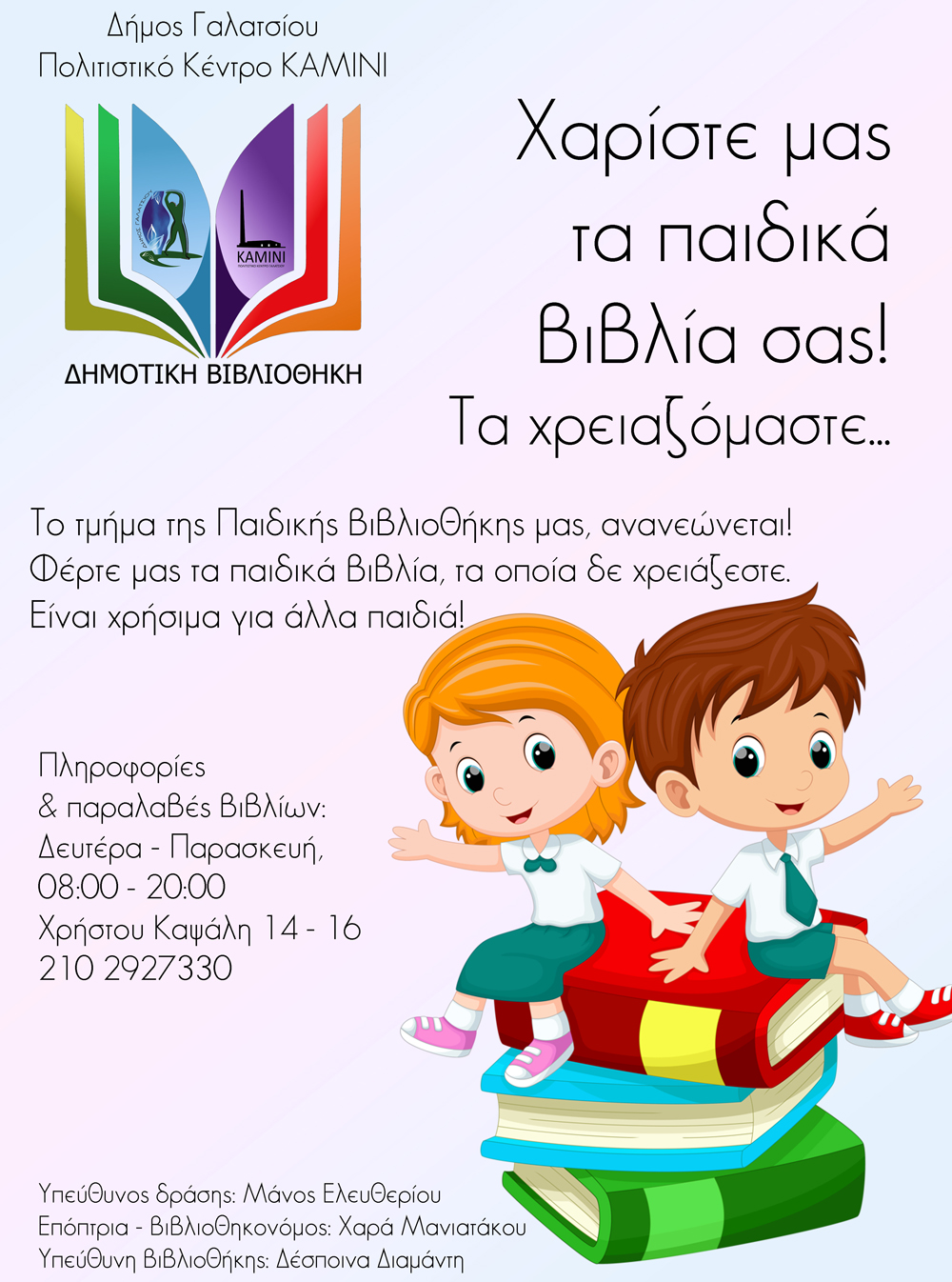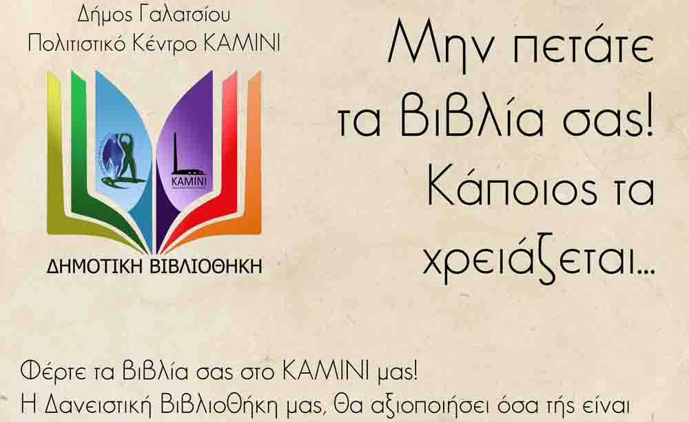 Η δημοτική Δανειστική Βιβλιοθήκη Γαλατσίου, ανακατασκευάζεται και αναβαθμίζεται. Για το λόγο θα αυτό, ζητά από τους δημότες να μην πετάνε τα βιβλία που δεν χρειάζονται πλέον, αλλά να τα καταθέσουν στο πολιτιστοικό κέντρο Καμίνι. Η Δανειστική Βιβλιοθήκη μας, θα αξιοποιήσει όσα τής είναι απαραίτητα. Τα υπόλοιπα, θα τα διαχειριστεί το τμήμα της Aνταλλακτικής & Χαριστικής βιβλιοθήκης.