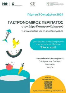 «Η ουσία του γαστρονομικού περιπάτου για την απώλεια και τη σπατάλη τροφής είναι να καταλάβουμε τη σημασία της επαναξιοποίησης των πόρων που στην εποχή μας καταναλώνονται και εξαντλούνται αλόγιστα σε βάρος του πλανήτη Γη και της ανθρωπότητας. Τα υπολείμματα τροφής αποτελούν ένα μεγάλο μέρος του κάδου των σκουπιδιών μας, που υπολογίζεται για την Ελλάδα γύρω στο 40% του συνόλου των Αστικών Στερεών Αποβλήτων. Μάλιστα, καθένας/μια από εµάς πετάει 87 κιλά τροφικών απορριµµάτων στη χωµατερή το χρόνο (πηγή: UNEP Food Waste Index Report 2024) που ευθύνονται για εκπομπές αερίων του θερμοκηπίου, επιβλαβή για το περιβάλλον και την υγεία μας. Στη φύση λειτουργεί αυτόματα το μοντέλο της σοφής διαχείρισης, όπου τίποτα δεν πετιέται και δεν πάει χαμένο. Εμείς πρέπει απλώς να το βάλουμε στην καθημερινότητά μας ξεκινώντας από τις κουζίνες μας!», καταλήγουν οι διοργανωτές.