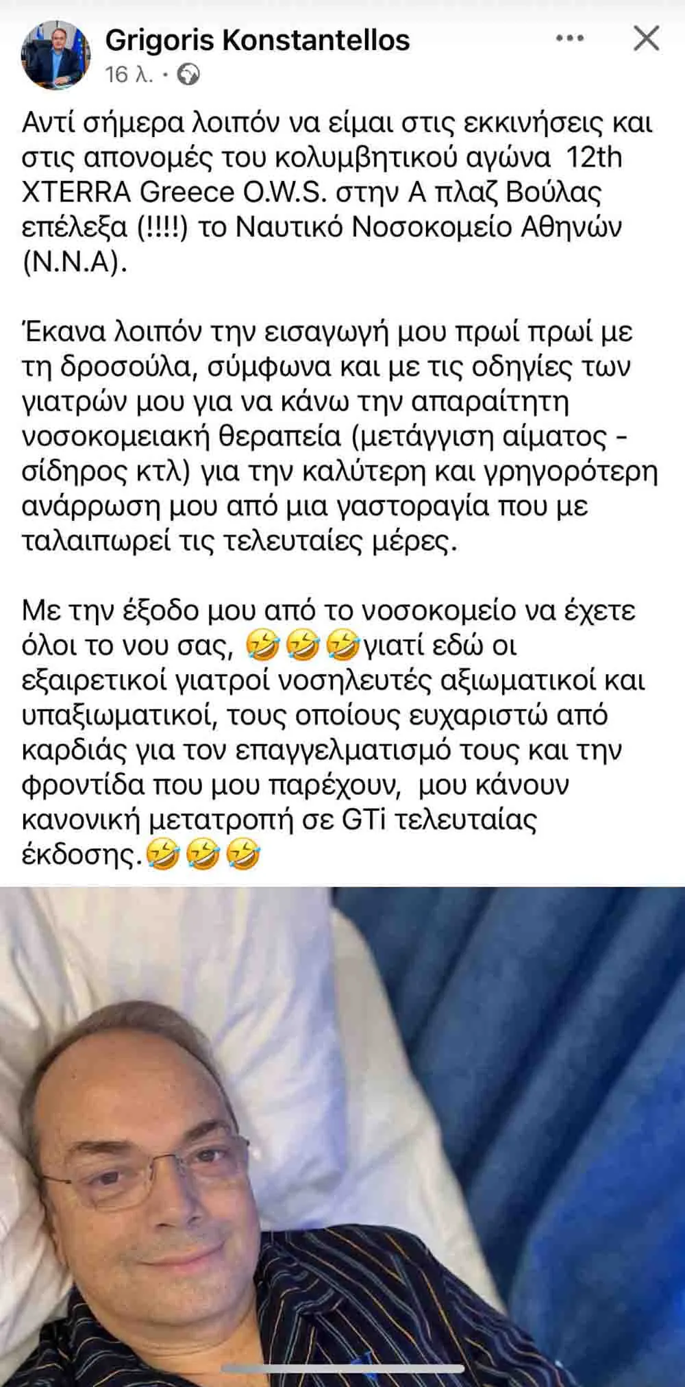 «Αντί σήμερα λοιπόν να είμαι στις εκκινήσεις και στις απονομές του κολυμβητικού αγώνα 12th XTERRA Greece O.W.S. στην Α΄ πλαζ Βούλας επέλεξα (!!!!) το Ναυτικό Νοσοκομείο Αθηνών (Ν.Ν.Α).