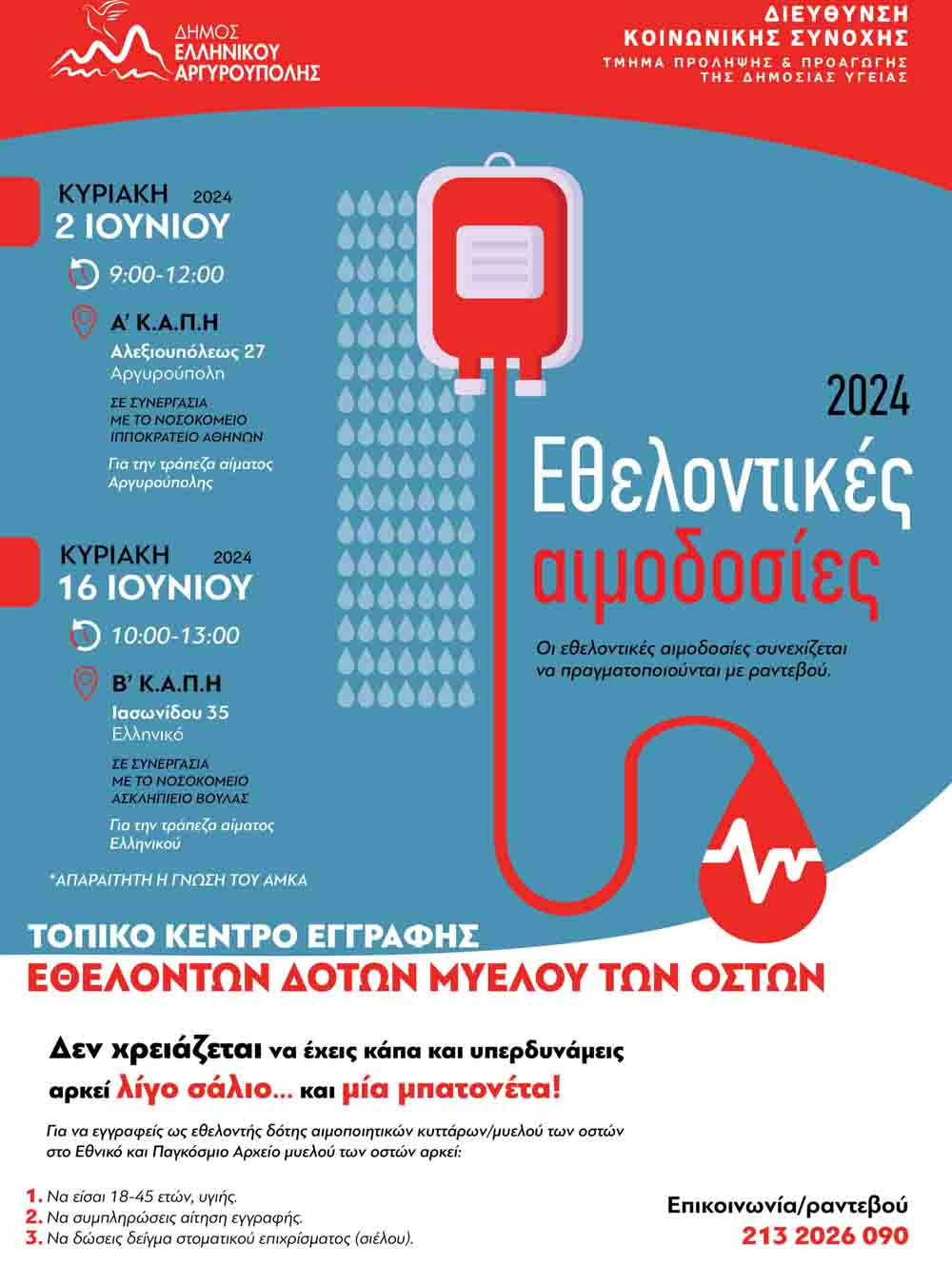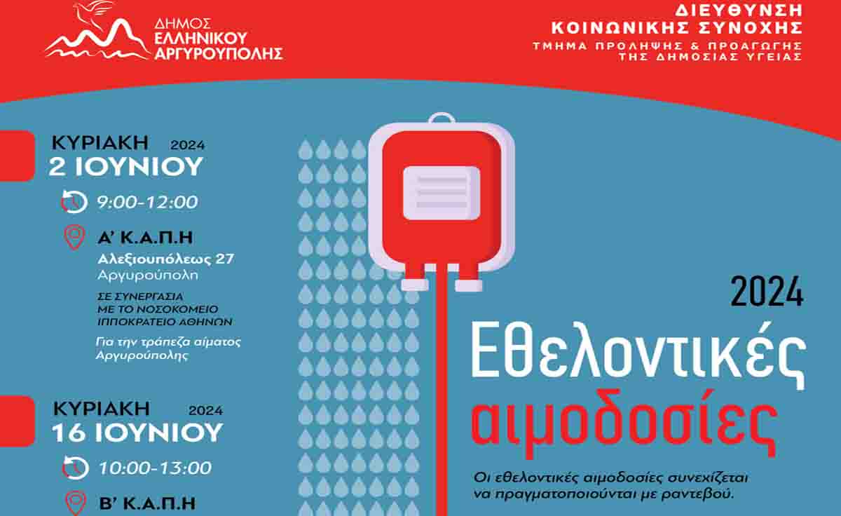 Ο Δήμος Ελληνικού-Αργυρούπολης συνεχίζοντας το καθημερινό κοινωνικό του έργο, για την ανάπτυξη της έννοιας του εθελοντισμού, της κοινωνικής αλληλεγγύης και τη στήριξη όσων έχουν ανάγκη σε αίμα, ανακοινώνει τις δεύτερες εθελοντικές αιμοδοσίες για το 2024.