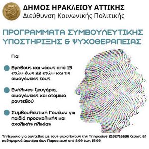 Ψυχολογική και συμβουλευτική υποστήριξη σε εφήβους και ενήλικες που νιώθουν ότι το έχουν ανάγκη συνεχίζει να προσφέρει ο Δήμος Ηρακλείου Αττικής, τονίζοντας ότι: «Οι ψυχολόγοι της Διεύθυνσης Κοινωνικής Πολιτικής είναι πάντα πρόθυμοι να προγραμματίσουν δωρεάν συνεδρίες με κατοίκους – δημότες που θα απευθυνθούν στην υπηρεσία».
