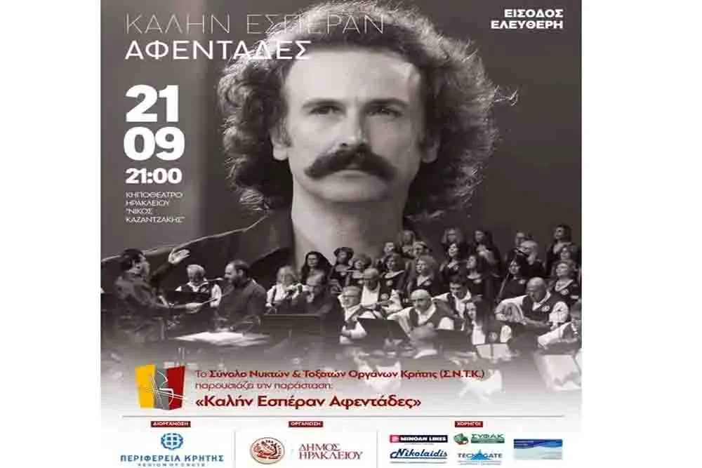 Το Σύνολο Νυκτών και Τοξοτών Οργάνων Κρήτης (Σ.Ν.Τ.Κ.) παρουσιάζει, με την υποστήριξη της Περιφέρειας Κρήτης, την Κυριακή 21 Σεπτεμβρίου και ώρα 21.00μ.μ. στο Κηποθέατρο «Νίκος Καζαντζάκης» τη μουσικοχορευτική παράσταση «Καλήν Εσπέραν Αφεντάδες». Οι εξαίρετοι ερμηνευτές Βαγγέλης Πυθαρούλης και Μενέλαος Νταγιαντάς συμπράττουν με τη χορωδία, τη χορευτική ομάδα και την πολυμελή ορχήστρα του Σ.Ν.Τ.Κ. και παρουσιάζουν αξέχαστα τραγούδια Ελλήνων συνθετών και της κρητικής παράδοσης, που έντυσε με την αγγελική φωνή και το δοξάρι του ο μύθος της ελληνικής μουσικής, Νίκος Ξυλούρης.