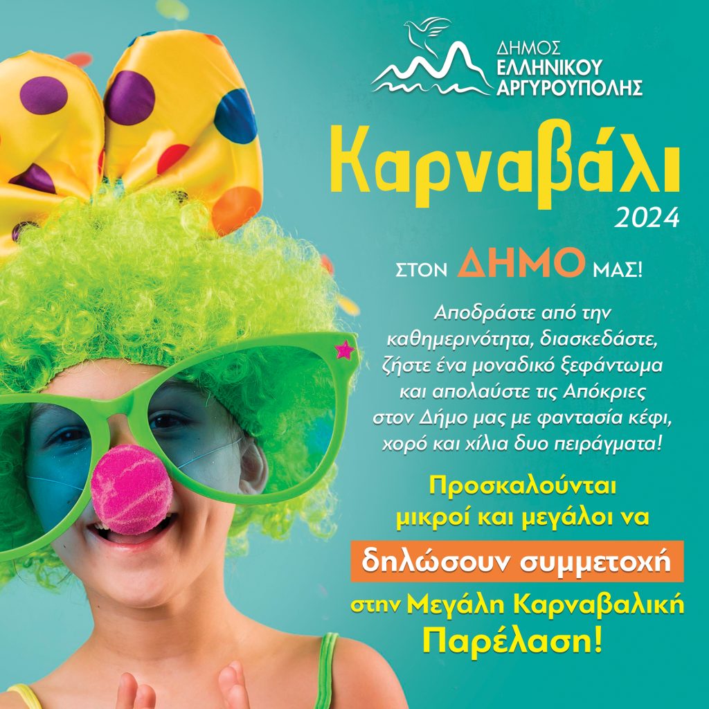 Το Καρναβάλι επανέρχεται με δυναμισμό και μεγάλες προσδοκίες για τη διοίκηση του δήμου Ελληνικού Αργυρούπολης, την Κυριακή 10 Μαρτίου 2024. Ο δήμος προσκαλεί μικρούς και μεγάλους να συμμετέχουν, στο φετινό καρναβάλι, δημιουργώντας οι ίδιοι ομάδες και ετοιμάζοντας καρναβαλικά θέματα.