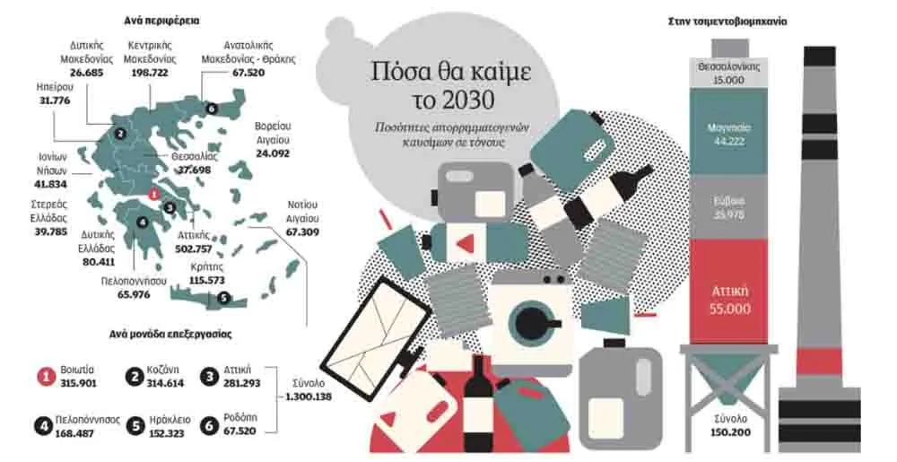 - Χωρίς συγκεκριμένη χωροθέτηση οι έξι μονάδες καύσης απορριμμάτων σε Αττική, Βοιωτία, Αρκαδία, Ροδόπη, Κοζάνη, Ηράκλειο Κρήτης.